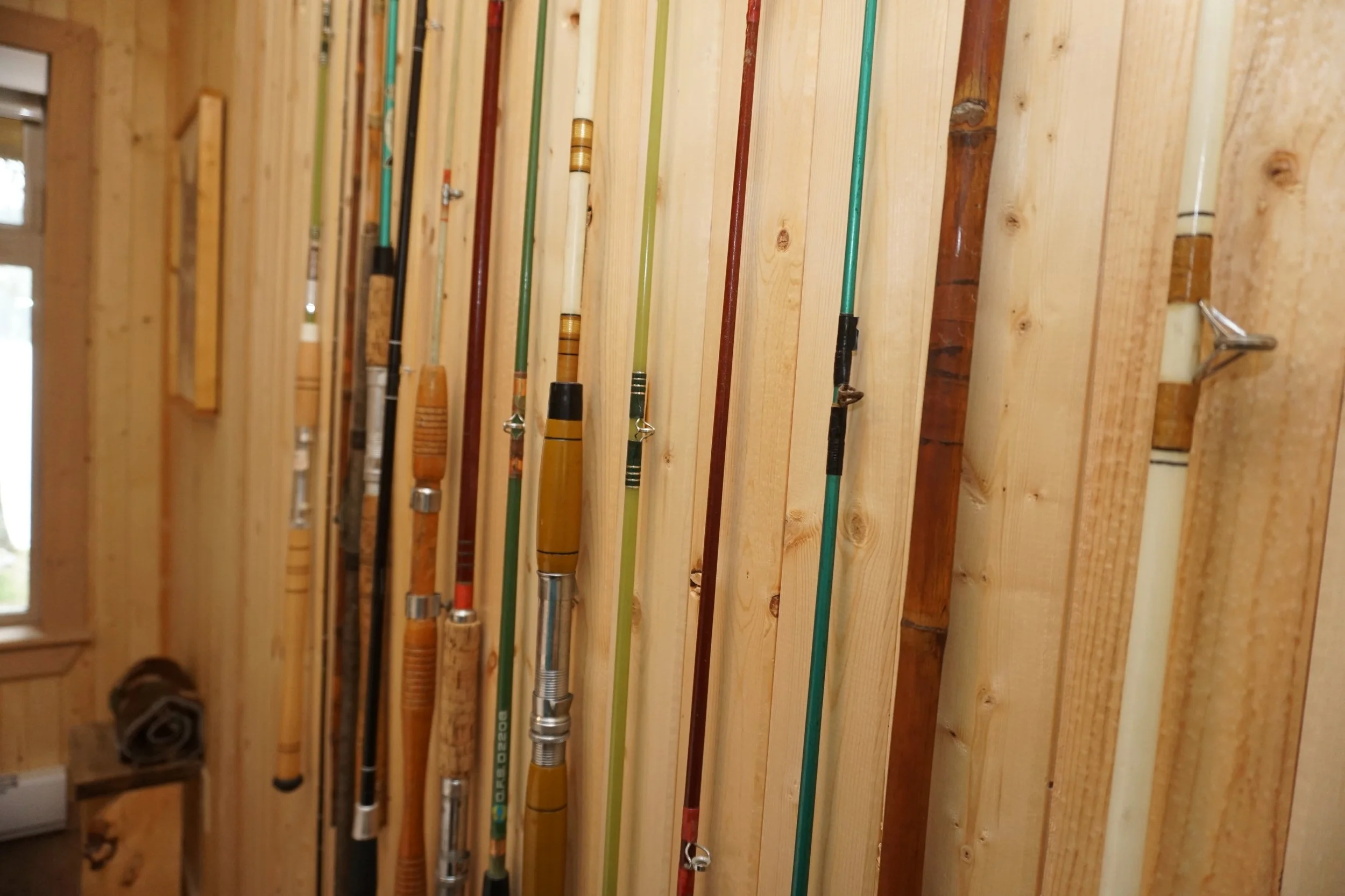 With their cork handles, maple wood shafts, and tones of vintage green, aged white, and mustard yellow, the vintage fishing rods offered layers of texture and nostalgic color. Arranged together, they form a beautiful wall display that honors the cabin’s fishing heritage.